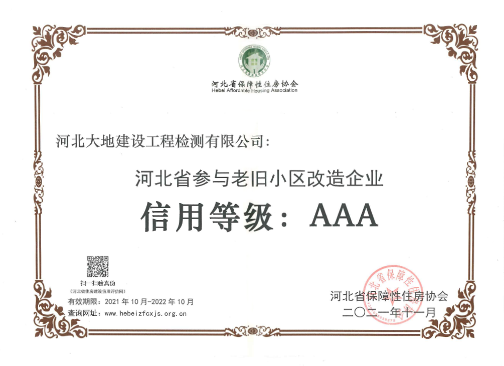 近日,大地检测喜获河北省保障性住房协会颁发的河北省参与老旧小区改造企业信用等级AAA证书。